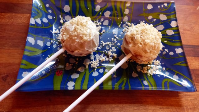 Quand vos cake pops sont bien froids, plantez-y un bâton à cake pop et, avec un couteau à beurre, recouvrez du glaçage au fromage chacun des cakes par petites touches comme si vous peigniez.