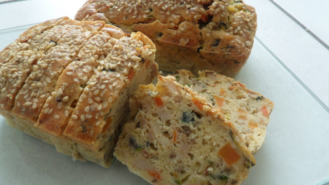 Il y a plus qu'à bien beurrer et fariner votre moule versez l'appareil et parsemez de graines de sésame et au four 35 minute environ à 180°C.
