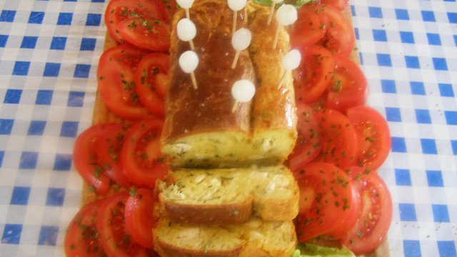 Bien beurrer un moule à cake et y verser la préparation obtenue ci-dessus puis mettre au four 40 min à 180°C. Servir chaud ou froid. Pour un repas le soir ou un pique-nique.