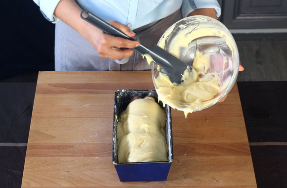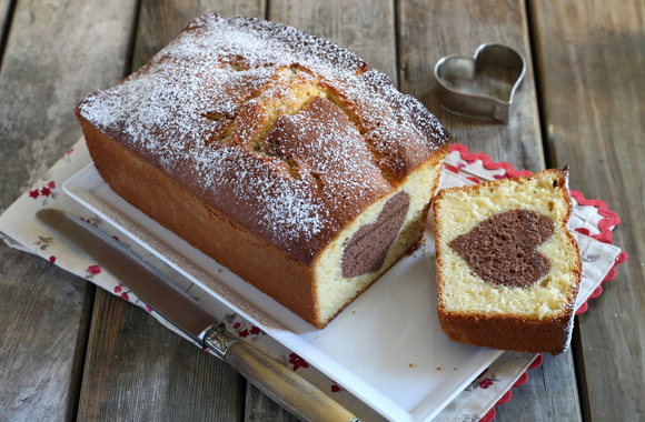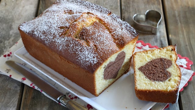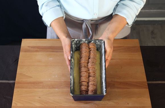 7Versez 1/4 de pâte nature dans un moule à cake beurré et fariné. Placez les coeurs tout le long du moule sur la pâte nature. Superposez-les par deux, afin de les placer le mieux possible dans le moule à cake.