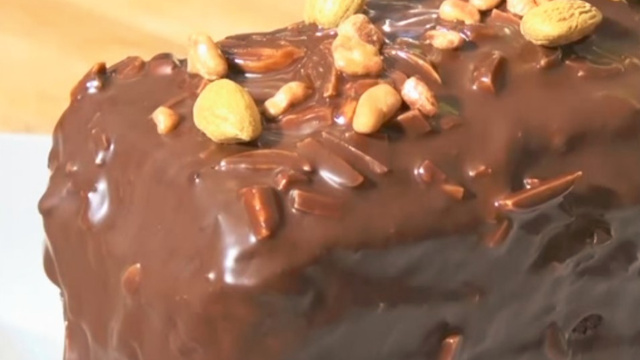 Un cake ultra gourmand garni de ganache au chocolat et de fruits secs.
