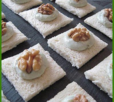 Déposer sur les canapés au roquefort, les cerneaux de noix et réserver au frais jusqu'à dégustation.