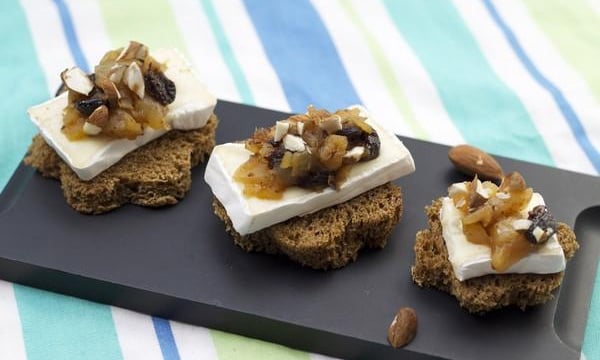 De délicieux canapés surmontés d'une compote de poire et de Caprice des Dieux. Une recette réalisée par Sandra du blog 'Ok Ce Bon !'.