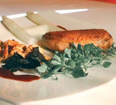En même temps, salez les champignons, faites-les revenir avec le beurre restant environ 5 mn. Au dernier moment, ajoutez persil et échalote. Tronçonnez les asperges et dressez les en 'H" pour figurer les poteaux, le magret en biais devant les asperges (ballon), les champignons de côté (spectateurs), la salade en bordure (pelouse). - 6