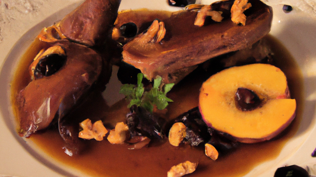 Canard cuit dans un nappage de sauce de pruneaux aux épices, accompagné de pruneaux fourrés au coing et quelques poires rôties.