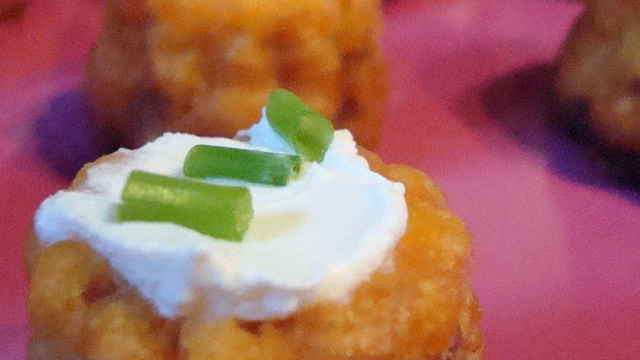 Une fois refroidis, déposer un peu de fromage frais sur chaque cannelés et parsemer d'un peu de ciboulette.