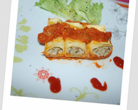 Dans un plat allant au four, mettre de la sauce de façon à recouvrir le fond. Poser de la farce au bord d'une feuille de lasagne et la rouler.