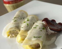 Lorsque les cannellonis sont cuits, les sortir délicatement du plat, les égoutter et les dresser sur une assiette en les nappant de sauce moutarde.