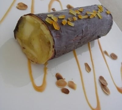 Un tube de pâte à lasagne contenant une compote parfumée, un enrobage au chocolat avec des pépites d'orange confite et un caramel au beurre salé.