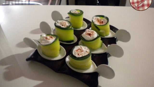 Formez vos cannelloni avec les lamelles de courgettes, vos pouvez les fermer avec un brin de ciboulette, garnissez à l'aide d'une cuillère a café avec votre mélange de crabe et pour finir saupoudrez d'un peu de paprika.