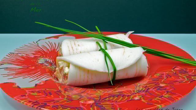 Etaler une tranche de jambon de la mer et déposez au milieu un peu de préparation et roulez. Fermez avec un brin de ciboulette et recommencez l'opération.