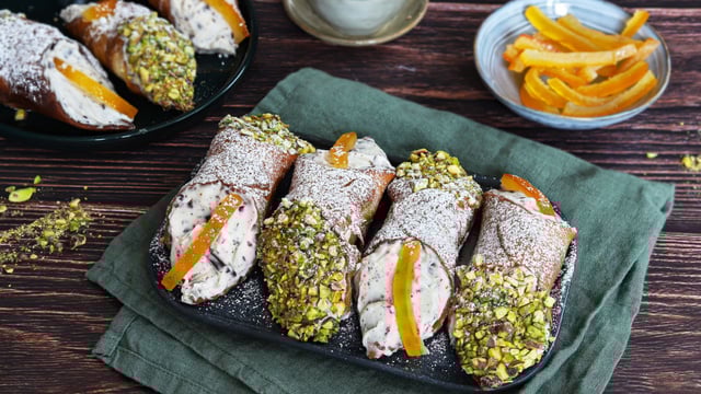 Décorez les cannolis d'un côté avec des pistaches grossièrement concassées et de l’autre côté avec des écorces d'oranges confites.