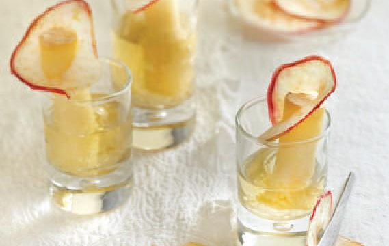 Tailler le fromage, creuser la gelée selon des formes adaptées aux morceaux de fromage et les y glisser. Servir aussitôt avec les chips de pomme. Idée : Remplacez le sirop par du miel et des épices.