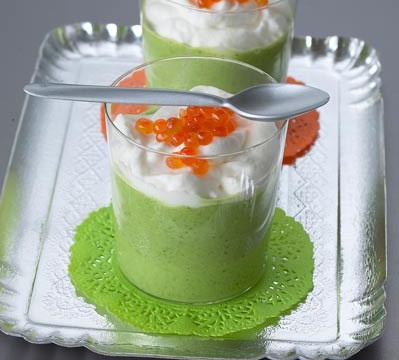 Au moment de servir, réchauffez le velouté et répartissez-le dans des verres (c'est plus beau pour la couleur). Recouvrez de crème bien froide et de 1 cuillère à café d'œufs de saumon. Servez aussitôt.