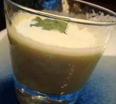 Un velouté d'artichauts violet accompagné d'une mousse de lait légère parfumée à la coriandre
