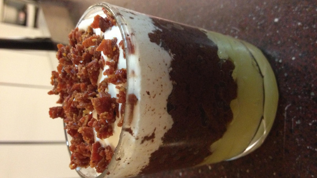Dresser dans un verre la pulpe de pommes, ensuite, le cappuccino de boudin et enfin la crème montée, parsemée de poudre de jambon.
