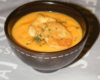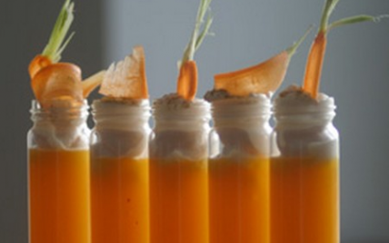 - Dans un bol, disposer le velouté de carottes surmonté d'une cuillère de crème fouettée, décorer de graines de cumin, de ciboulette et de copeaux de carotte crue. Déguster.