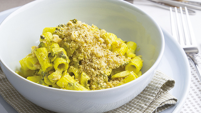 Égouttez les pâtes et mélangez avec la sauce aux champignons, joliment colorée grâce au curcuma.