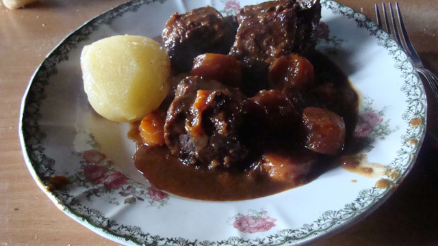Du boeuf, de la bière, du pain d'épices et des pommes de terre cuites en papilotte.