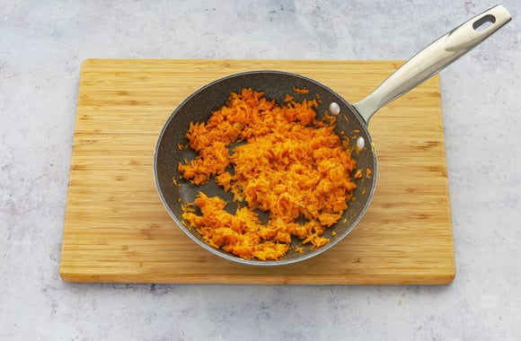 Râpez les carottes. Râpez l'ail au dessus d'une sauteuse, ajoutez l'huile d'olive. Faites rissoler, puis ajoutez les carottes râpées. Salez, poivrez, ajoutez toutes les épices et faites cuire 3 minutes.