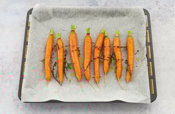 Disposez les carottes sur la plaque du four tapissée de papier sulfurisé.Salez, poivrez, parsemez de romarin et de thym, arrosez avec l'huile d'olive et mélangez.
