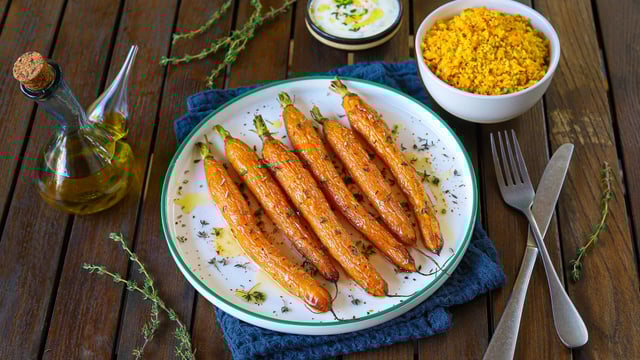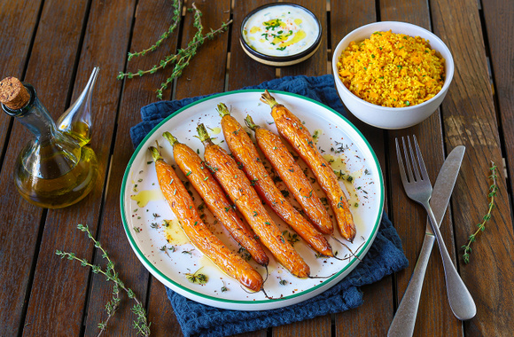 Voilà un plat végétarien original, simple et savoureux qui met les carottes à l'honneur. Faciles à préparer, ces carottes rôties au four sont accompagnées d'un couscous rapide aux carottes et d'une sauce au yaourt qui apporte une note de fraîcheur au plat, très agréable.
