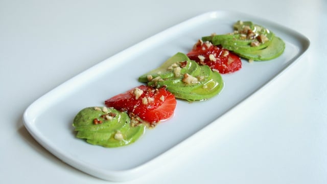Disposer les lamelles d'avocat et de fraises sur deux assiettes, arroser chacune d'une cuillère à soupe d'huile de noix, d'un tour de moulin et de noix concassées.