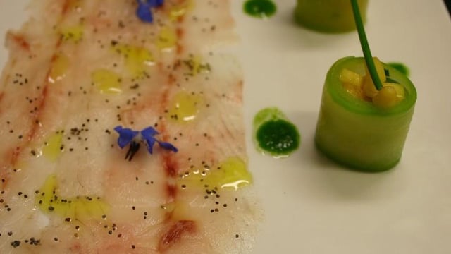 Desarêtez les filets de bar, et mettez-les au congélateur 10 mn pour les raidir. Coupez de fines tranches de bar, ajoutez un peu d'huile de roquette, disposez les makis de mangues. Ajoutez au dernier moment un peu de fleur de sel sur le bar.