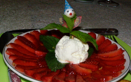 Laver puis équeuter les fraises. Les essuyer délicatement et les couper en tranches pour les disposer en éventail sur quatre assiettes de service. Les arroser de jus de citron au fur et à mesure. Ranger au frais.
