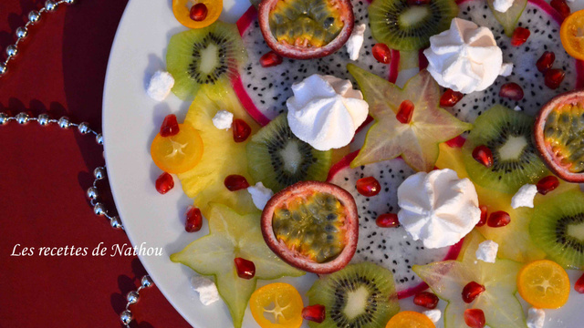 Délicieux, fruité, léger et plein de vitamines.Voici mon carpaccio de fruits exotiques arrosé de citron vert et rhum, avec ses petites meringues (pas faites maison cette fois) !