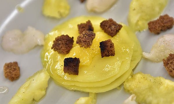 Découpez vos fruits en très fines lamelles et disposez-les dans vos assiettes.
