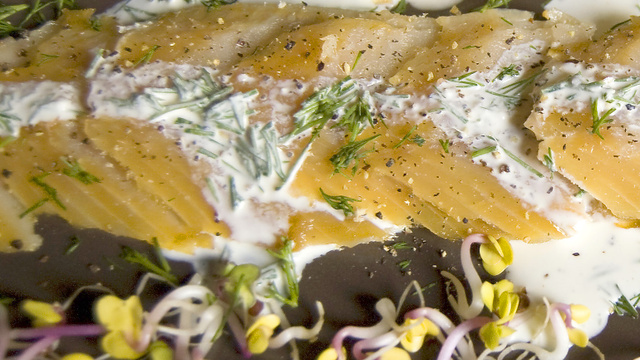 Mélanger la crème, la vodka, l'aneth et le poivre.