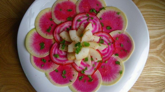 Eplucher la poire et la betterave crapaudine. Couper à la mandoline les radis red meat et la betterave crapaudine. Couper la poire en fines lamelles. Disposer le tout joliment dans une assiette.