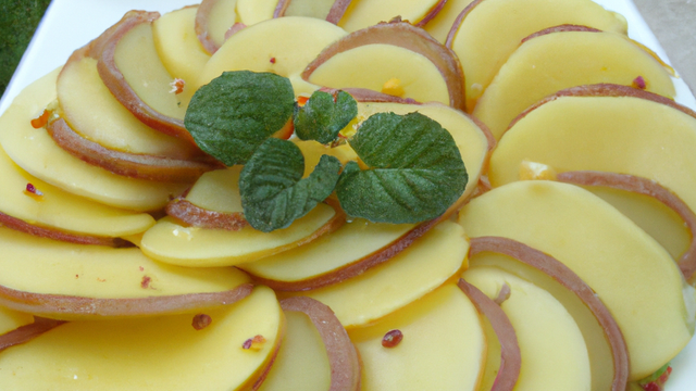 Hachez finement au couteau le zeste de citron.Eplucher les pommes de terre.Emincez-les finement et cuire 10 min à partir de l'ébullition.Egouttez délicatement et disposez-les harmonieusement sur 4assiettes.Salez ,poivrez et arrosez d'huile.Ciselez la ciboulette,copeaux de parmesan,de feuilles de basilic et zeste de citron