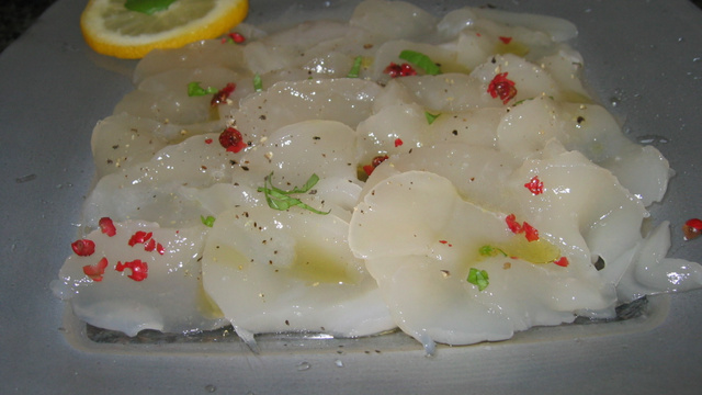 Séparer le corail des noix de Saint Jacques. Escaloper finement les noix de Saint Jacques et disposer les en rosace au centre de l'assiette.