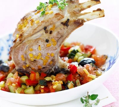 - Lavez un pamplemousse puis prélevez son zeste. Mélangez-le avec la fleur de sel, et assaisonnez les carrés d'agneau avec cette préparation, poivrez.Pressez deux pamplemousses. Pelez à vif le pamplemousse restant et prélevez les suprêmes (quartiers sans peau).Lavez les courgettes, les poivrons et coupez-les en petits dés avec les olives. Ajouter les quartiers de pamplemousse coupés en deux.