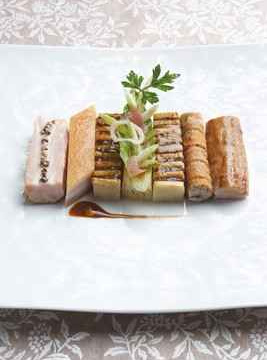 - Cuire les morceaux de poitrine dans un bouillon aromatique à feu très doux puis mettre à refroidir. Détailler en barre de la même taille que la garniture précédente et colorer à feu doux en arrosant régulièrement.