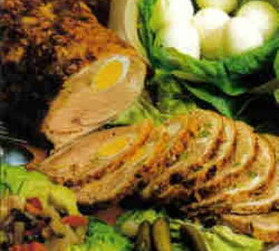 2- Faites durcir trois oeufs. Pelez un oignon, émincez-le et faites-le revenir doucement dans un peu de beurre. Hors du feu, ajoutez le ris de veau découpé, la mie de pain humectée, le porc haché fin, le cœur d'artichaut coupé en morceaux, les petits pois écossés, deux oeufs battus, du sel et du poivre. Etendez cette farce sur le carré de veau. Ajoutez les pistaches, le parmesan, la marjolaine et les trois oeufs durs.