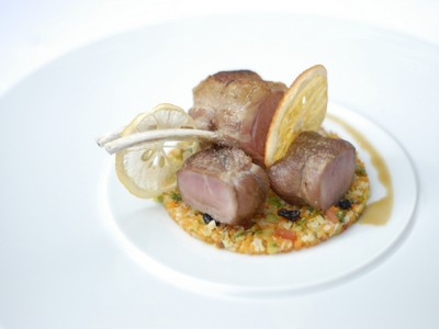 - 7Faire un lit de semoule de façon circulaire. Disposer les morceaux d'agneau dessus. Verser le jus délicatement en corolle sur l'agneau. Ajouter une chips d'orange et de citron.