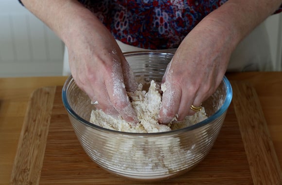 3Incorporez-le du bout des doigts jusqu'à ce que le mélange s'amalgame. Si le mélange est trop sec, ajoutez une cuillère à soupe de lait ou d'eau.