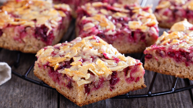 Des petits carrés aux fruits rouges qui peuvent se déguster en toutes saisons. Fondants à l'intérieur et croquantes sur le dessus avec les amandes caramélisées.