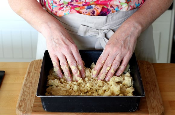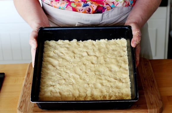 Versez cette pâte dans un moule carré de 23 cm de coté et huilé. Pressez-la doucement avec vos doigts, afin de lâ??étaler de manière uniforme.