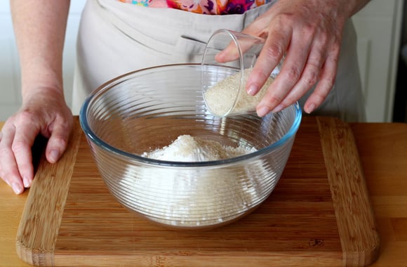 Versez la farine dans un bol, ajoutez le sucre.