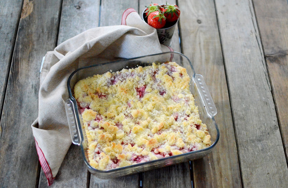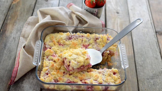 Une base de pâte à cookies, une garniture au fromage frais et fraises et du crumble sur le dessus pour terminer ce gâteau gourmand et facile à préparer.
