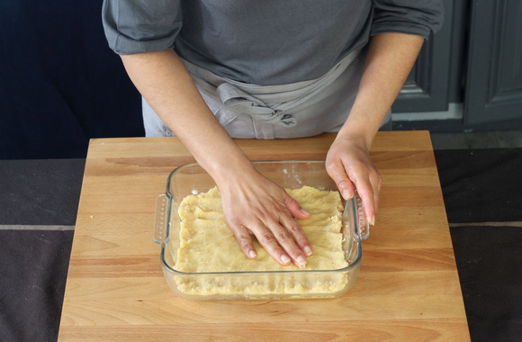 6Garnissez un moule carré de 20x20 cm avec la pâte à cookies puis faites cuire 5 minutes dans un four préchauffé à 180°C. Laissez refroidir et préparez la garniture.