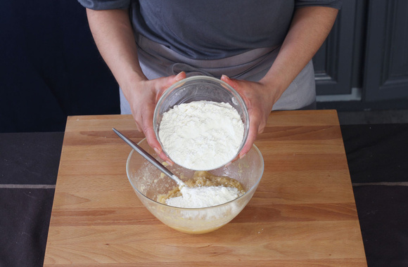 4Ajoutez la farine tamisée avec le bicarbonate de soude.