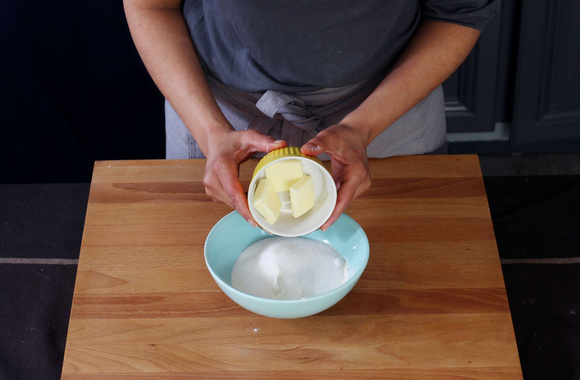 Dans un grand saladier, mélangez du bout des doigts le beurre, le sucre, la poudre d'amande et la farine.