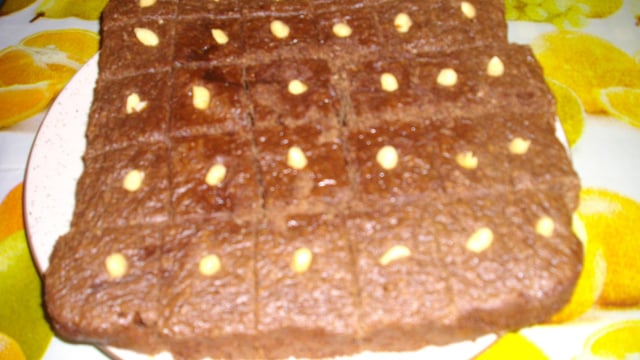 Quand le gâteau est froid, le couper en petits carrés et mettre en décoration des cacahuètes ou des noisettes.