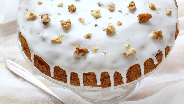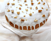 Quand le gâteau est froid, versez-le glaçage, lissez et ajoutez les noix concassées.