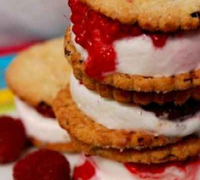 Placez chaque tranche de glace sur un biscuit, posez trois framboises sur chaque glace, couvrez enfin d'un autre biscuit et... écrasez... Il n'y a plus qu'à déguster.